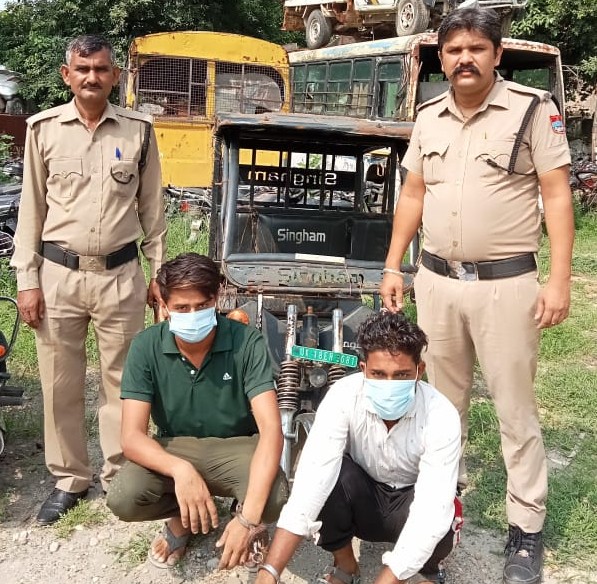 खड़कपुर देवीपुरा निवासी उमेश गोस्वामी पुत्र बनवारी लाल गोस्वामी ने आईटीआई थाने में तहरीर देकर बताया कि 6 जून की रात्रि 11 बजे वह अपनी ई-रिक्शा में रोडवेज बस स्टेशन से दो सवारियां लेकर दोहरी परसा जा रहा था। आईजीएल गेट से दोहरी परसा रेलवे फाटक के आगे पहुंचने पर वह एक जगह लघुशंका के लिए रुका। ई-रिक्शा साइड लगाकर वह कुछ दूर जाकर लघुशंका करने लगा। इसी दौरान रिक्शा में बैठे दोनो लोग उसका ई-रिक्शा स्टार्ट कर भागने लगे। पीछा करने पर वे हाथ नहीं आए। पुलिस ने धारा 379 आईपीसी के तहत केस दर्ज कर विवेचना एसआई राकेश राय के सुपुर्द की। साथ ही इस दुस्साहसिक वारदात के अनावरण हेतु पुलिस अधीक्षक काशीपुर अभय सिंह व क्षेत्राधिकारी काशीपुर वंदना वर्मा के निर्देशन तथा प्रभारी निरीक्षक आईटीआई आशुतोष कुमार सिंह के नेतृत्व में एक टीम का गठन किया। गठित पुलिस टीम द्वारा तलाश सुरागरसी पतारसी के दौरान दभौरा टाण्डा मुस्तकहम थाना आईटीआई निवासी विशालजीत सिंह पुत्र स्व. हरदीप सिंह और विशाल सिंह पुत्र ब्रहमेश सिंह को गिरफ्तार कर उनकी निशांदेही पर बरखेड़ी फोरलेन हाईवे पुल से करीब 300 मीटर आगे खेतों में झाड़ियों के पास से ई-रिक्शा बरामद कर लिया। अभियुक्तों द्वारा ई-रिक्शे के तीनों टायर, बैटरी तथा इंजन राह चलते व्यक्तियों को बेचना बताया गया। अभियुक्तगण के पूर्व आपराधिक इतिहास की जानकारी की जा रही है। पुलिस टीम में आशुतोष कुमार सिंह प्रभारी निरीक्षक थाना आईटीआई, उपनिरीक्षक राकेश राय, कांस्टेबल नीरज शुक्ला, उमेश तोमक्याल व कांस्टेबल दीपक कठैत एसओजी काशीपुर शामिल थे।