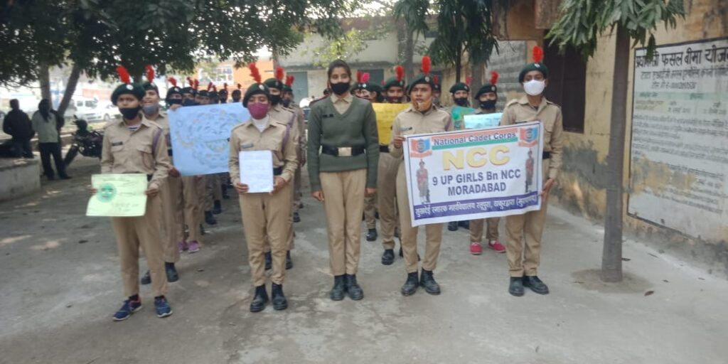 ठाकुरद्वारा में पुलिस क्षेत्राधिकारी कार्यालय पर मास्क लगाने के लिए जागरूकता रैली निकालती एनसीसी की छात्राएं