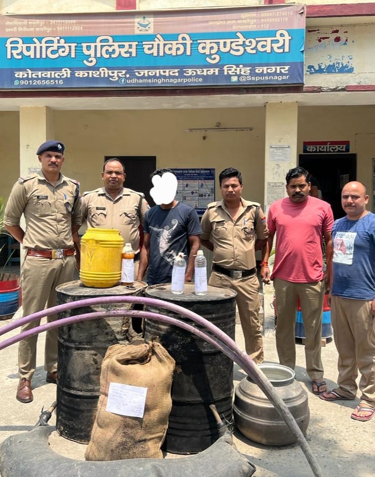 काशीपुर। वरिष्ठ पुलिस अधीक्षक उधम सिंह नगर द्वारा जनपद में चलाए जा रहे अवैध शराब की रोकथाम और बिक्री पर कार्रवाई करते हुए कुंडेश्वरी चौकी पुलिस द्वारा मालवा फार्म  के पास बहल्ला नदी के किनारे रम्पुरा में कच्ची शराब बना रहे सुरेंद्र सिंह उर्फ छिंदर पुत्र जोगेंद्र सिंह को एक जूट के बोरे में 72 पाउच में भरी 60 लीटर कच्ची शराब तथा रबर की ट्यूब में भरी 40 लीटर कच्ची शराब एवं शराब बनाने के उपकरणों के साथ गिरफ्तार कर उसके खिलाफ आबकारी अधिनियम की धारा 60 ;2द्ध के तहत मुकदमा दर्ज किया है। पुलिस टीम में उप निरीक्षक सुरेंद्र सिंह चौकी प्रभारी कुंडेश्वरी, कां. किशोर कुमार, कुलदीप व दीवान गिरी शामिल थे।
