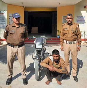 हरिद्वार। कोतवाली रानीपुर पुलिस ने क्षेत्र से चोरी हुई बाइक के साथ एक आरोपी को गिरफ्तार किया है। जिसके खिलाफ पुलिस ने सम्बंधिात धाराओं में मामला दर्ज कर लिया। जिसको मेडिकल के बाद न्यायालय में पेश कर जेल भेज दिया। कोतवाली रानीपुर प्रभारी निरीक्षक नरेन्द्र सिंह बिष्ट ने बताया कि सतीश कुमार निवासी मित्र विहार कॉलोनी फुटबॉल ग्राउंड जगजीतपुर कनखल ने 10 नवम्बर को तहरीर देकर शिकायत की थी। शिकायत में कहा गया था कि उसकी बाइक अज्ञात द्वारा धार के बाहर से चोरी कर ले गया। उसके द्वारा बाइक की काफी तलाश की गयी, लेकिन कोई सुराग नहीं लगा। पुलिस ने तहरीर के आधार पर अज्ञात के खिलाफ मुकदमा दर्ज कर बाइक की तलाश शुरू कर दी। पुलिस ने घटना स्थल के आसपास लगे सीसीटीवी कैमरों को खंगालते हुए चोर की शिनाख्त के प्रयास करते हुए तलाश शुरू कर दी। पुलिस बाइक की तलाश में जुटी थी। इसी दौरान पुलिस ने फाउंड्री गेट के पास से चोरी की बाइक के साथ एक आरोपी को दबोच लिया। पूछताछ के दौरान आरोपी ने अपना नाम केतन आनंद पुत्र स्व. पवन कुमार निवासी निर्मला छावनी कोतवाली नगर हरिद्वार बताया है। पुलिस ने आरोपी के खिलाफ सम्बंधित धाराओं में मामला दर्ज कर लिया। जिसको मेडिकल के बाद न्यायालय में पेश कर जेल भेज दिया।
