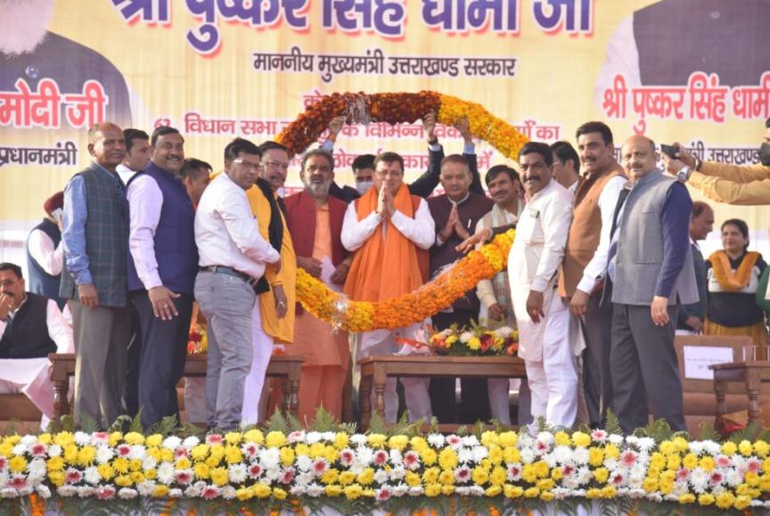 जसपुर। मुख्यमंत्री पुष्कर सिंह धामी ने आज मंडी परिसर पहुँचकर 1650.66 लाख रूपये की योजनाओं का लोकार्पण एंव शिलान्यास किया। जिसमें 61.43 लाख रुपए लागत की 3 योजनाओं का लोकार्पण व 1589.23 लाख रुपये लागत की 9 योजनाओं का शिलान्यास शामिल है। जिसमें पंचायत महुआडाबरा में 19.85 लाख रुपये की लागत के मानसरोवर झील निर्माण कार्य, 35 लाख रुपये की लागत के वार्ड नम्बर 2 व 5 के निर्माण कार्य, 6.58 लाख रुपये लागत से शहीद स्थल पुनर्निर्माण कार्य का लोकार्पण व 169.82 लाख रुपए लागत की गणेशपुर-केशपुरी ग्राम समूह पेयजल योजना, 199.40 लाख रुपये लागत की तलाबपुर ग्राम समूह पेयजल योजना, 444.67 लाख रूपये लागत की राजपुर ग्राम समूह पेयजल योजना, 445.18 लाख रूपये लागत की नारायणपुर ग्राम समूह पेयजल योजना,49.20 लाख की लागत से विकास खण्ड जसपुर की ग्राम पंचायत गढ़ीहुसैन में हाईवे से टयुबवैल व नहर की पुलिया से होते हुए टांडा प्रभावपुर लिंक मार्ग की ओर सी.सी.मार्ग का निर्माण, 49.20 लाख की लागत के ग्राम पंचायत कलियावाला में ग्राम कल्याणपुर से नहर होते हुए कलियावाला तक सी.सी.मार्ग का निर्माण, 30 लाख की लागत से नगर क्षेत्र जसपुर के नत्था सिंह मोहल्ला (अनुसूचित जाति) में बारात घर का निर्माण, 30 लाख की लागत से विकास खण्ड जसपुर के ग्राम श्यामनगर में बारातघर का निर्माण कार्य, 175.76 लाख की लागत से नेहरू रा.इ.का. महुआडाबरा में 01 पुस्तकालय कक्ष,01 कम्प्यूटर कक्ष,04 ए.सी.आर. कक्ष, एंव 03 प्रयोगशाला (जीव विज्ञान प्रयोगशाला,रसायन विज्ञान प्रयोगशाला एवं भौतिक विज्ञान प्रयोशाला ) निर्माण कार्य शामिल हैं।