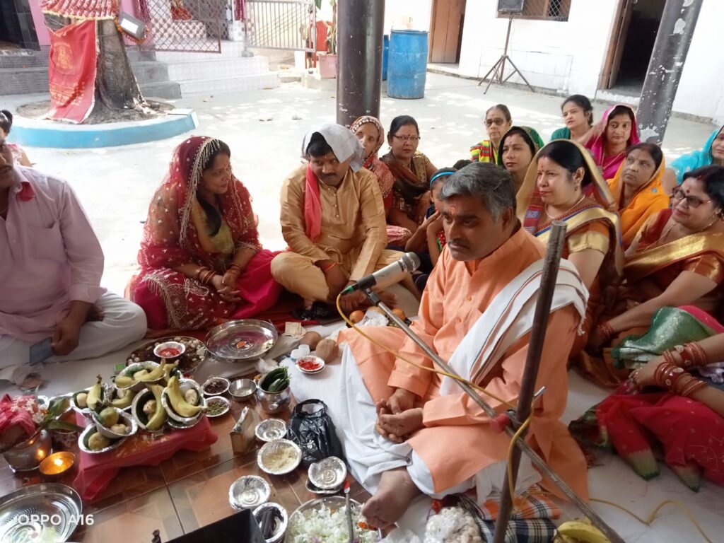 ठाकुरद्वारा नगर के चित्रगुप्त मंदिर में हवन पूजन यज्ञ करते श्रद्धालु
