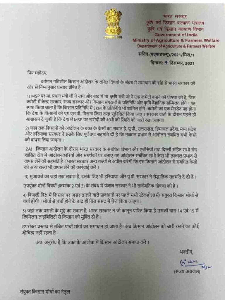 केंद्र सरकार ने इस बार सीधे संयुक्त किसान मोर्चा की 5 मेंबर्स हाईपावर कमेटी से मीटिंग की। हाईपावर कमेटी के मेंबर बलबीर राजेवाल, गुरनाम चढ़ूनी, अशोक धावले, युद्धवीर सिंह और शिवकुमार कक्का नई दिल्ली स्थित ऑल इंडिया किसान सभा के ऑफिस पहुंचे, जहां वीडियो कॉन्फ्रेंसिंग के जरिए केंद्रीय गृह मंत्रालय के अफसर भी जुड़े। सबसे बड़ा पेंच केस पर फंसा था, जिसे तत्काल वापस लेने पर केंद्र राजी हो गया।